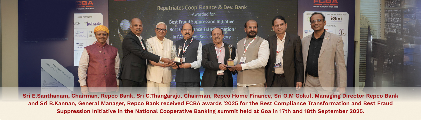 Repatriates Cooperative Finance and Development Bank Ltd. (REPCO BANK) was registered on November 19, 1969, as a Cooperative Society under the relevant provisions of the Madras Cooperative Societies Act, 1961, with jurisdiction over the State of Tamil Nadu, Andhra Pradesh, Karnataka, Kerala and the Union Territory of Puducherry.